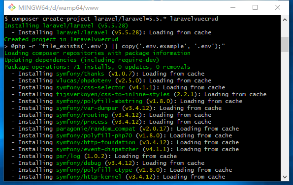composer create-project laravel/laravel=5.5.* laravelvuecrud #指定laravel版本为5.5.*如果需要最高版本可以去掉版本约束,指定项目名称 |