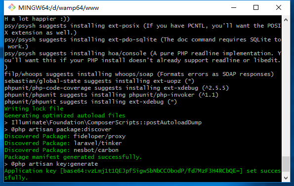 看到successfully代表laravel安装成功,如果没有成功请换淘宝镜像重写安装.