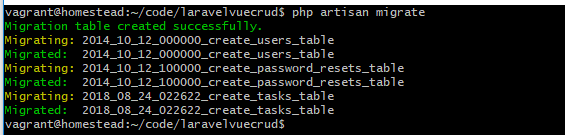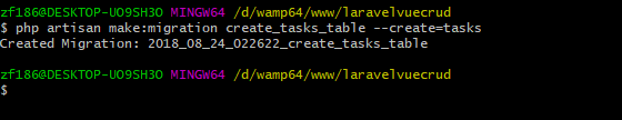 cd laravelvuecrud #进入项项目目录 php artisan make:migration create_tasks_table --create=tasks #创建数据迁移文件 |
