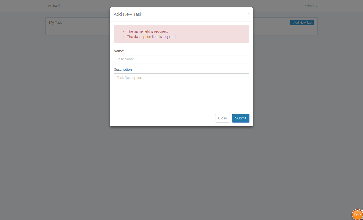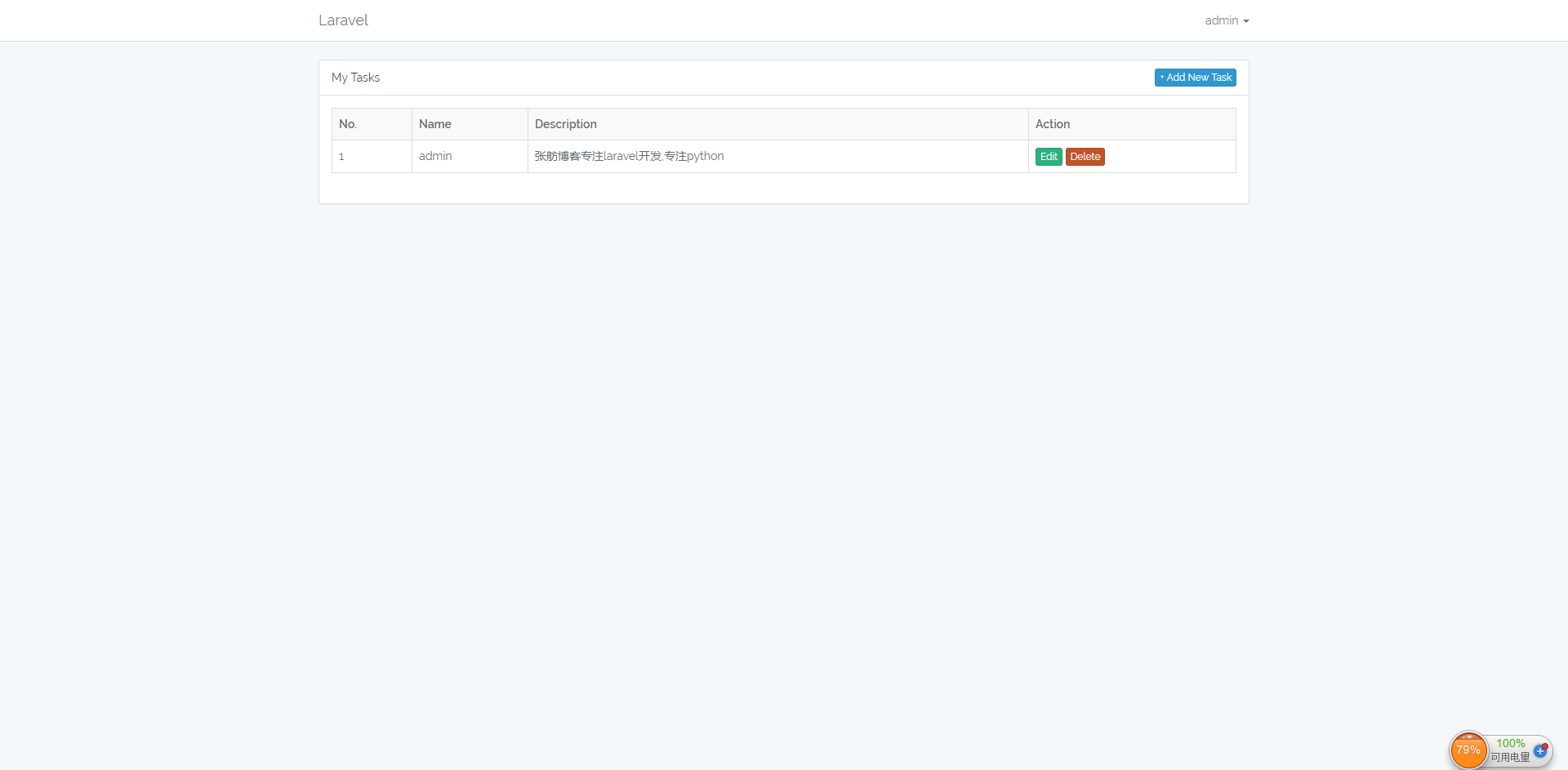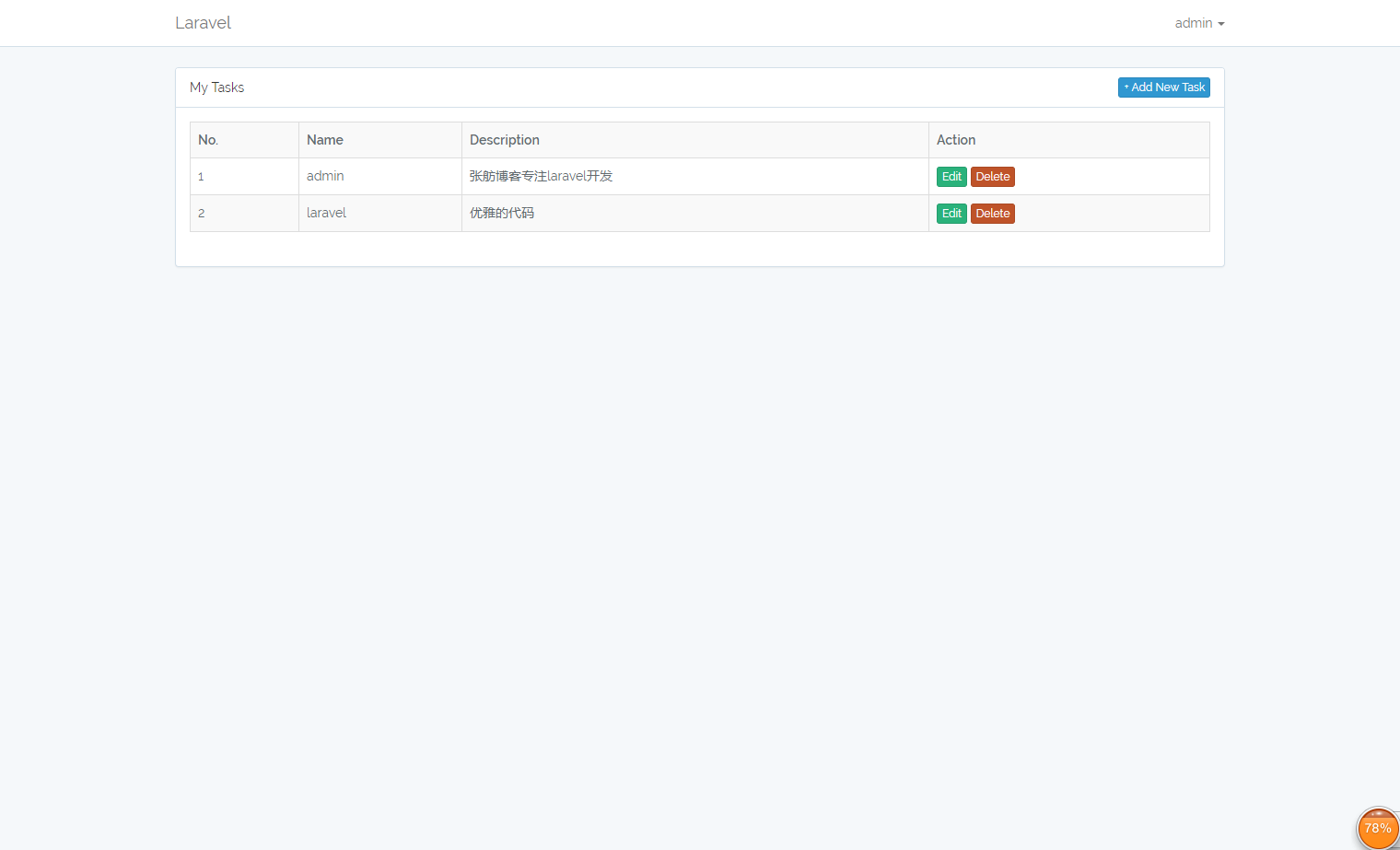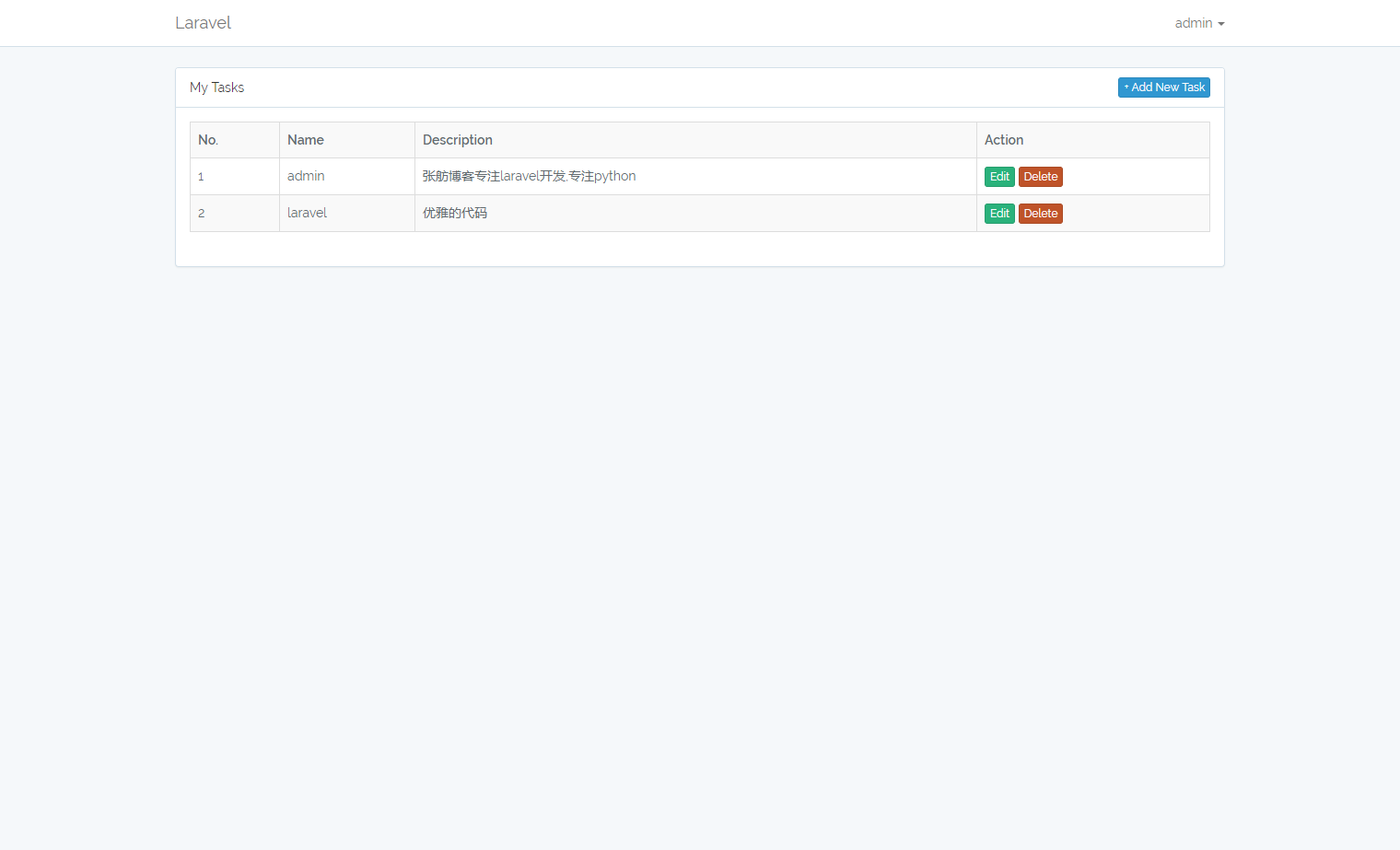 use Illuminate\Support\Facades\Auth; #别忘了引入它 . . . public function store(Request $request) { $this->validate($request, ['name' => 'required|max:255', 'description' => 'required',]); #数据验证 $task = Task::create(['name' => request('name'), 'description' => request('description'), 'user_id' => Auth::user()->id]); #创建数据 return response()->json(['task' => $task, 'message' => 'Success'], 200); #返回消息 } . . . |