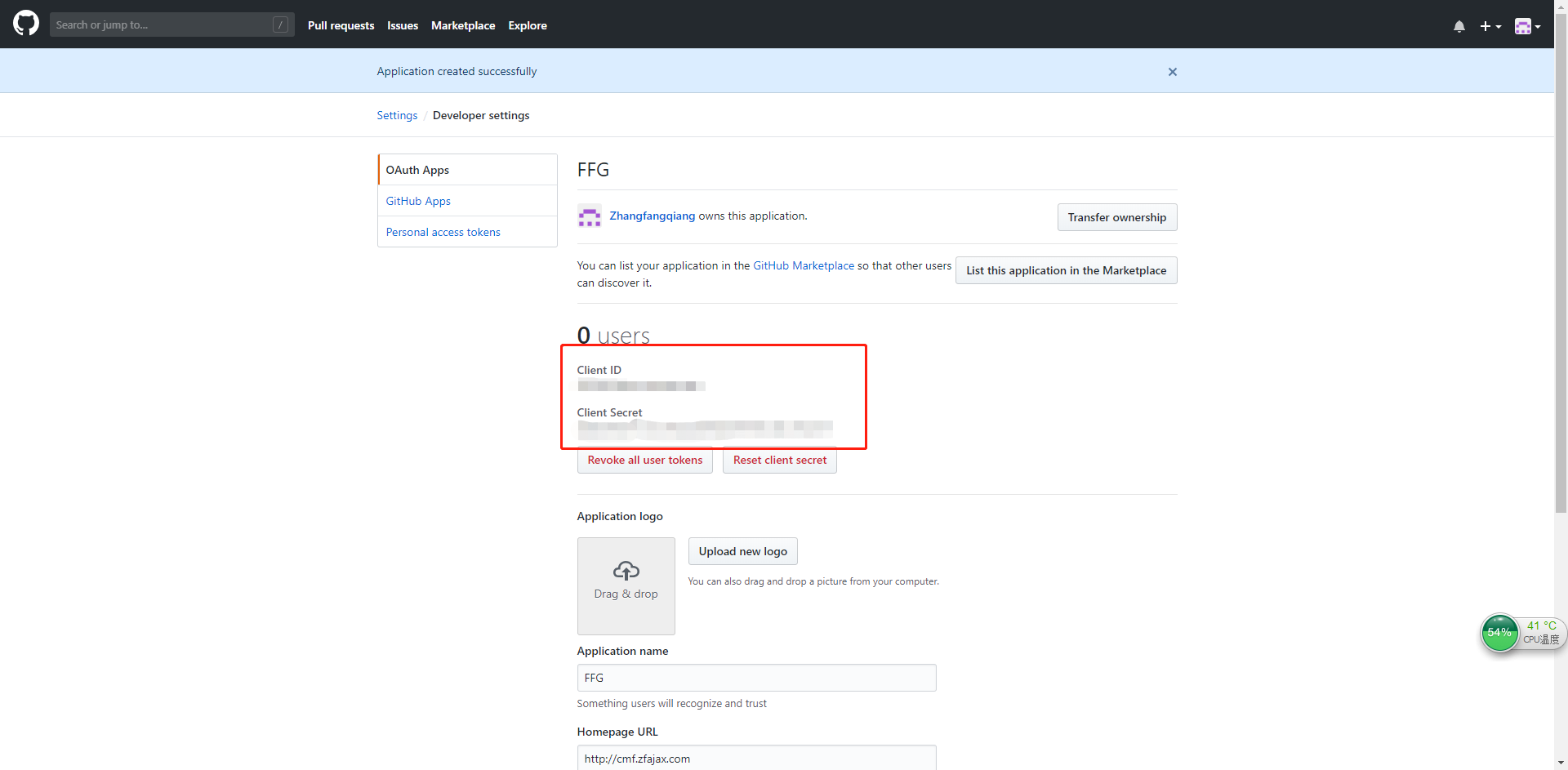 注册成功之后你就会看到clientID和clientSecret