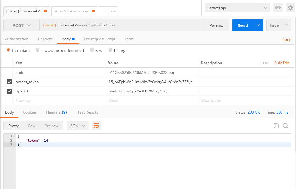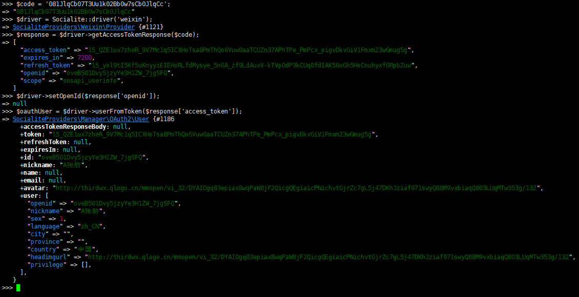 $ php artisan tinker $code = '081JlqCb07T3Uu1k02Bb0w7sCb0JlqCc'; $driver = Socialite::driver('weixin'); $response = $driver->getAccessTokenResponse($code); $driver->setOpenId($response['openid']); $oauthUser = $driver->userFromToken($response['access_token']); |