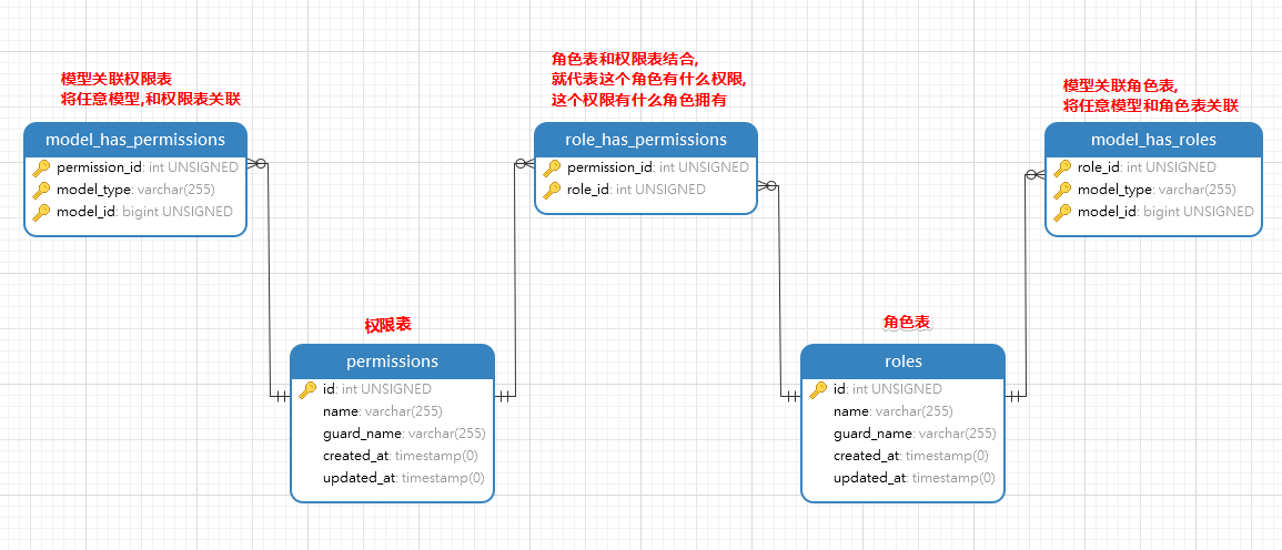 我们还需在 User 中使用 laravel-permission 提供的 Trait —— HasRoles,此举能让我们获取到扩展包提供的所有权限和角色的操作方法。