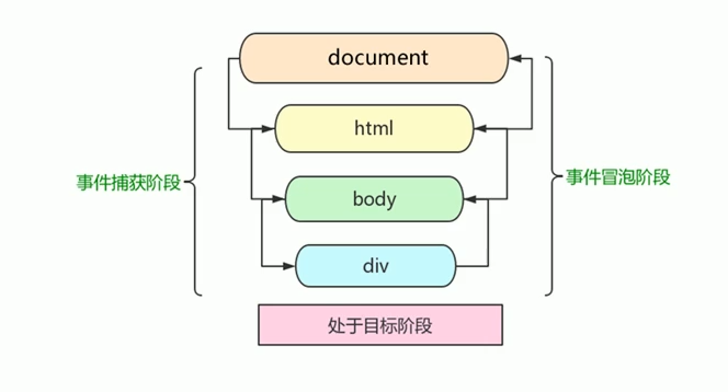- 捕获阶段 :网景最早提出,,由DOM最顶层节点开始,然后逐级向下传播到最具体的元素接收到的过程.从最高层开始调用方法