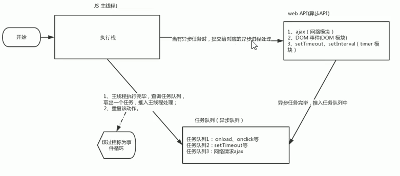 - 一旦执行栈中的所有同步任务执行完毕,系统就会按照次序读取任务队列中的异步任务,被读取的异步任务结束等待,进入执行栈,开始执行