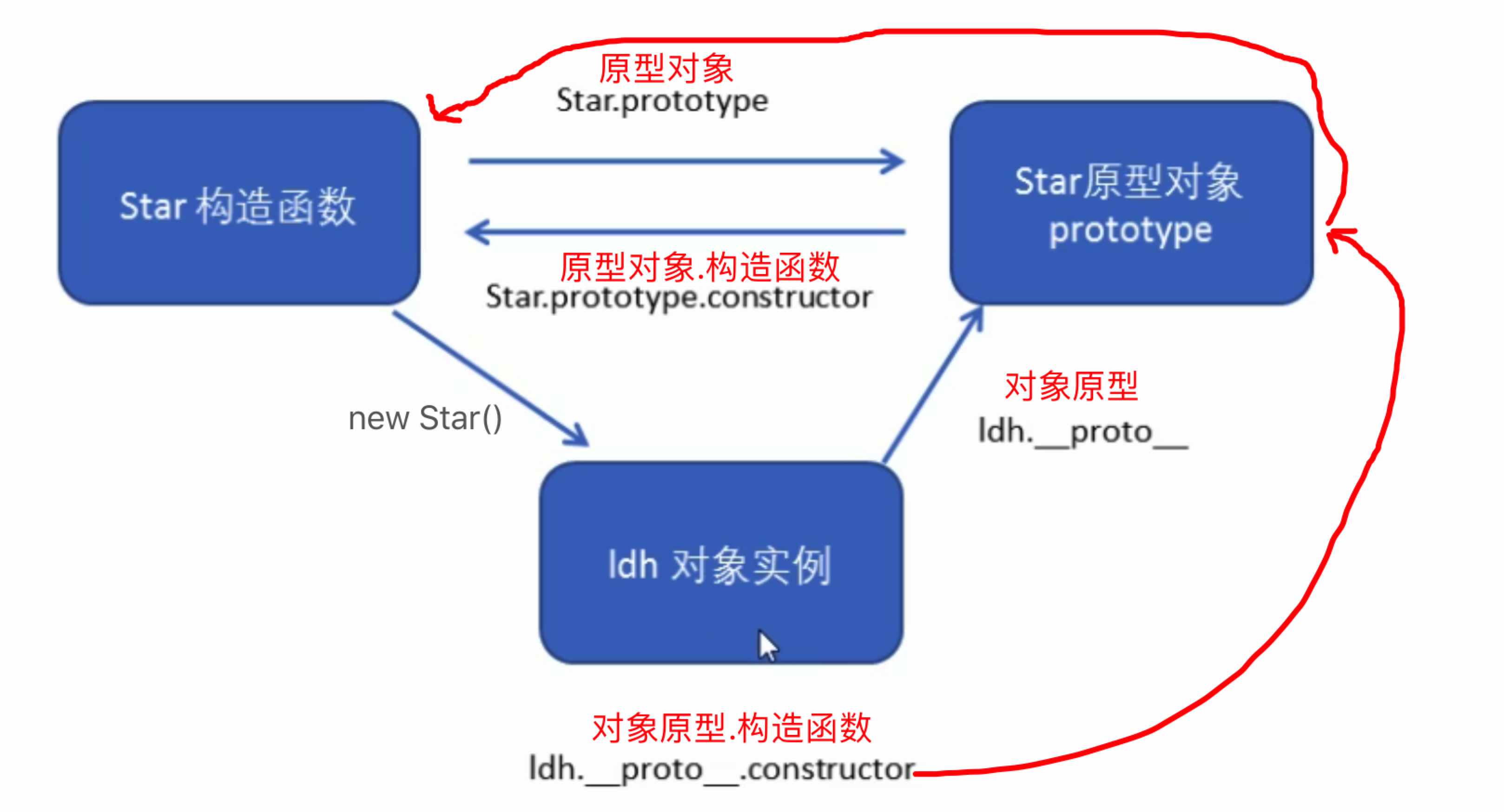 • 对象原型 (__proto__) 和 构造函数(prototype) 原型对象里面都有一个constructor属性,constructor我们成为构造函数,因为他指回构函数本身.