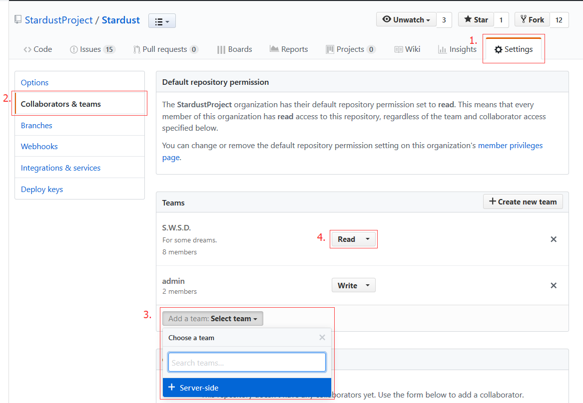 step2. 点击进入刚创建的仓库,选择 “Settings” -> “Collaborators & teams”,选择刚建的 team,将权限设置为 read: