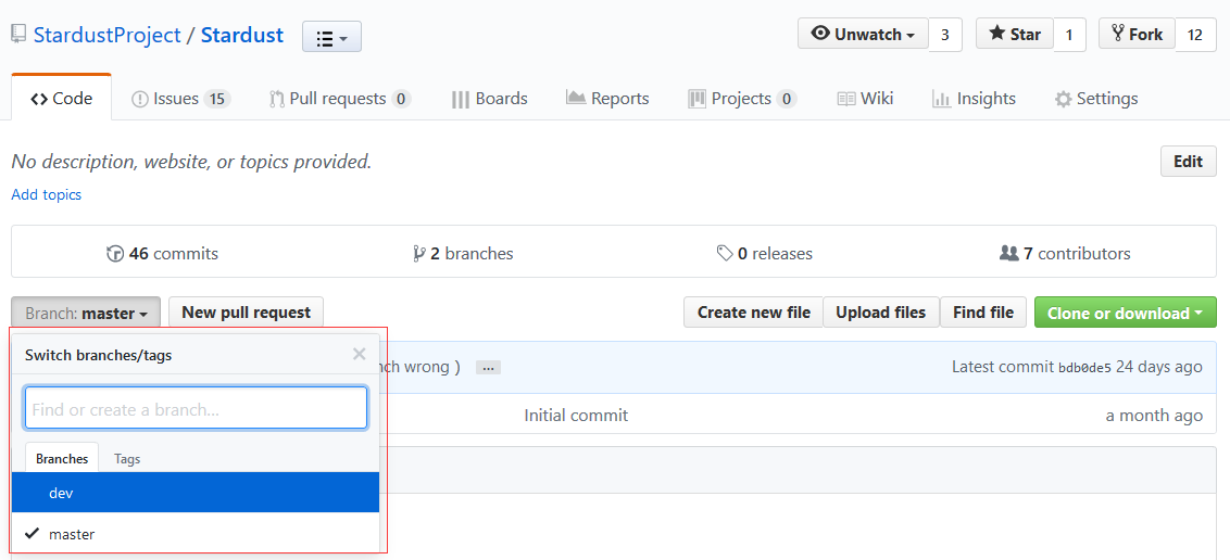 step1. 在输入框 “Find or create a branch…” 处键入dev,创建开发分支。