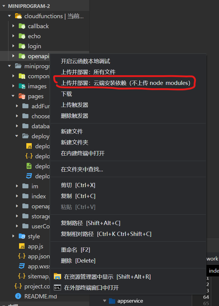 上传配置云函数,鼠标点击右键,并且安装云端依赖