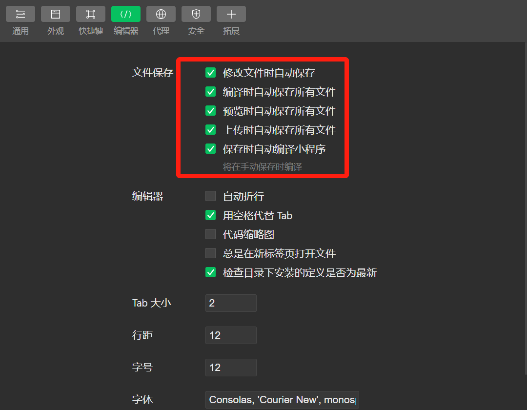 点击’设置’->’编辑器设置’ ,将这些自动保存选择上,这样就不用手动保存了